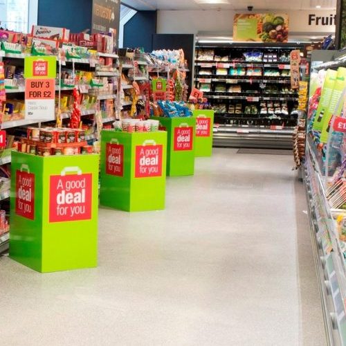 Expositores de pie, tótems,, stoppers, glorificadores, cubre-alarmas, vinílios de suelo, banderolas y carteles, banners, etc...