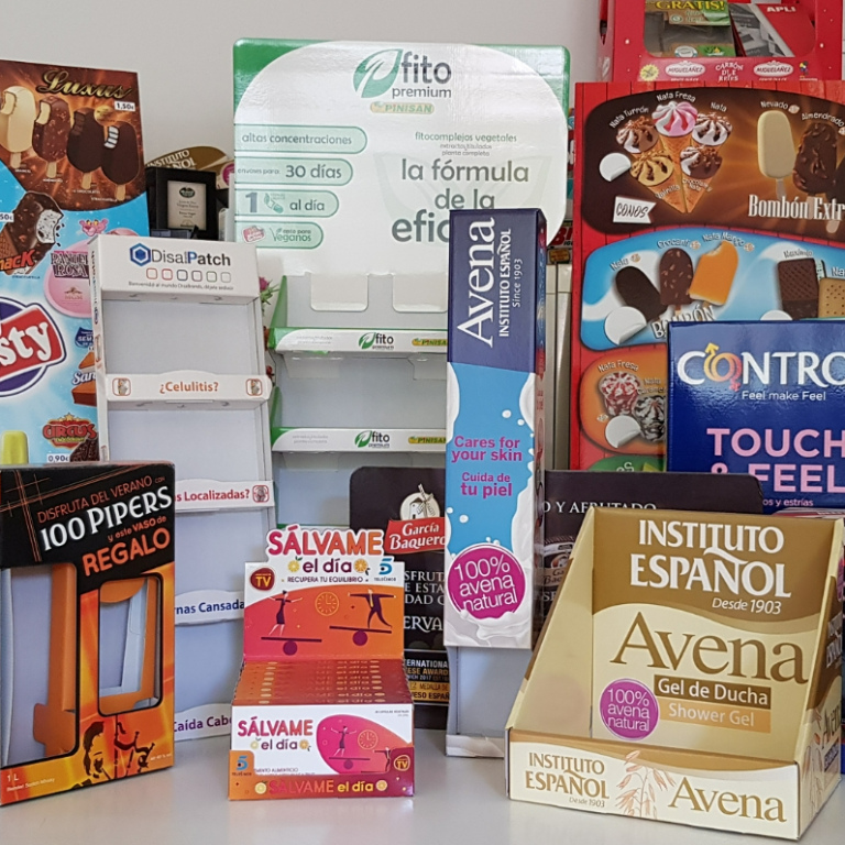 Expositores de baldas, cajas expositoras con cartela, cajas agrupadoras de lineal, carteles.